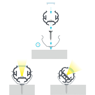 Nedan ser ni ett par illustrationer på hur aluminiumprofilen sätts ihop samt ett antal olika alternativ för montering av LED-listen.