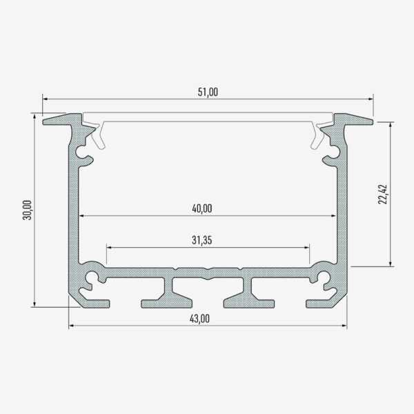 Aluprofil för infällt montage som är 51mm bred. Passar till exempel för att bygga linjärbelysning infällt i tak.