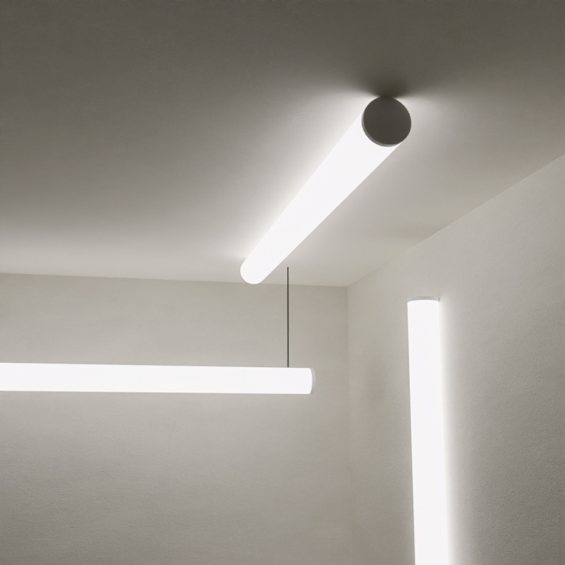 Robust, rund LED-profil med 50 mm diameter – idealisk för att skapa linjära armaturer med modern och iögonfallande design. Kan monteras dikt an i tak eller vägg, alternativt pendlas för mer visuell effekt.