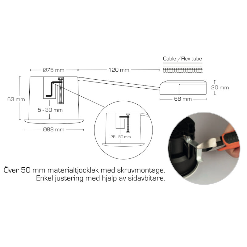 | Mått | Diam 88mm, Höjd 63mm. OBS. Håltagning 75mm |