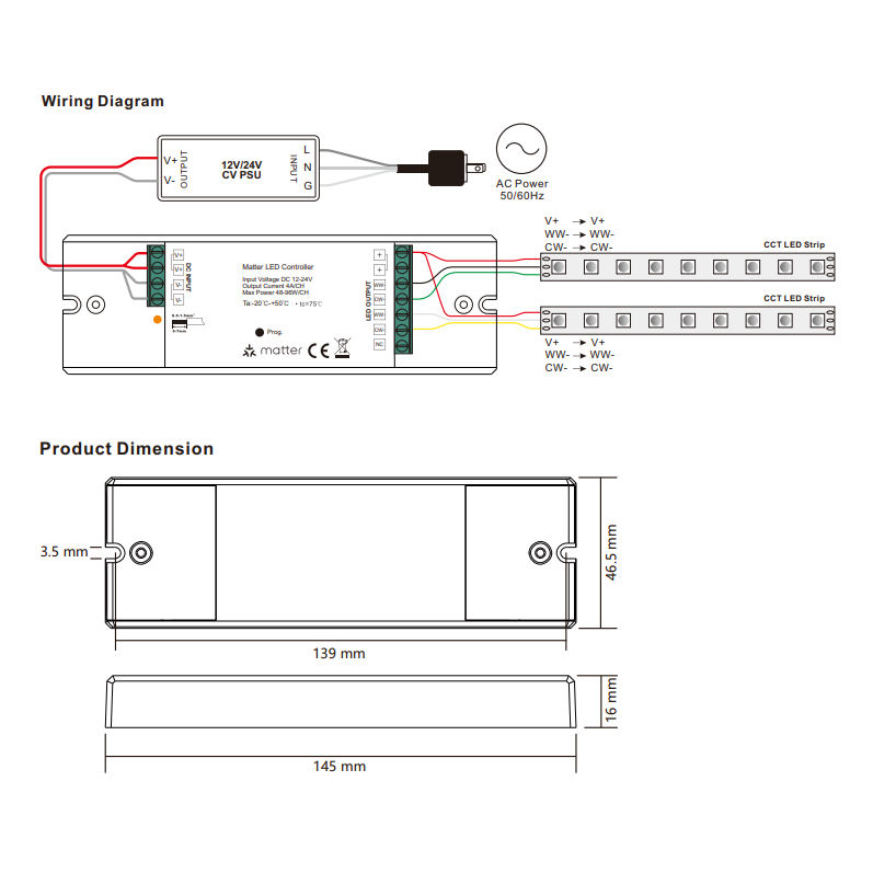 Matter styrenhet för att dimra och styra ljusfärgen på tuneable white (dynamisk vit) LED-lister och LED-strips. Styrenheten kopplas in mellan en transformator och led-listen. Många ledlister kan kopplas till Matter-styrningen och alla styrs lika.